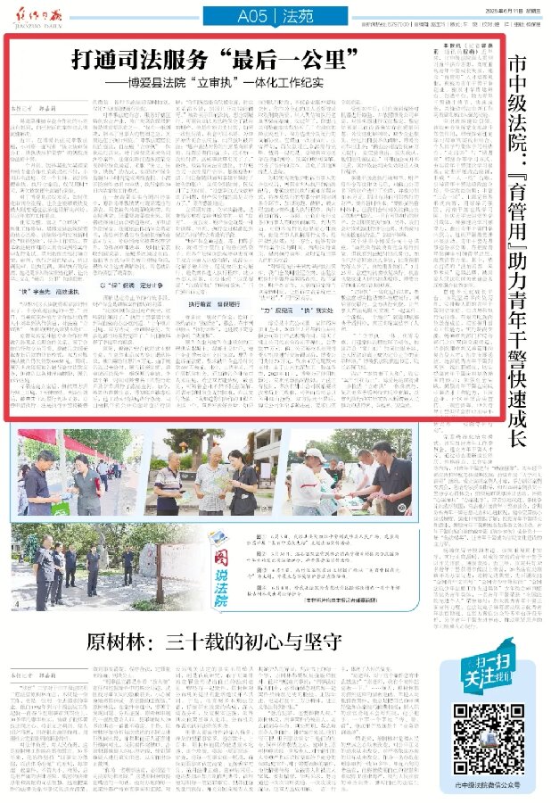 6月11日,《焦作日报》法院专版头条刊发标题为《打通司法服务“最后一公里”》的工作通讯,详细介绍了博爱县人民法院孝敬法庭开展“立审执”工作以来的具体做法和取得的成效,受到一致好评。