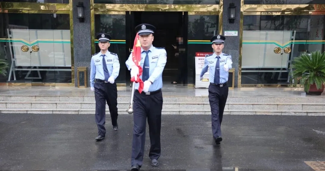 8时10分,升国旗仪式准时开始。伴随着嘹亮的《义勇军进行曲》,护旗手迈着稳健的步伐护送五星红旗走向旗台。在全体干警的注视下,鲜艳的国旗冉冉升起、迎风飘扬,大家神情肃穆,面向国旗行注目礼,向伟大的祖国致以崇高敬意。